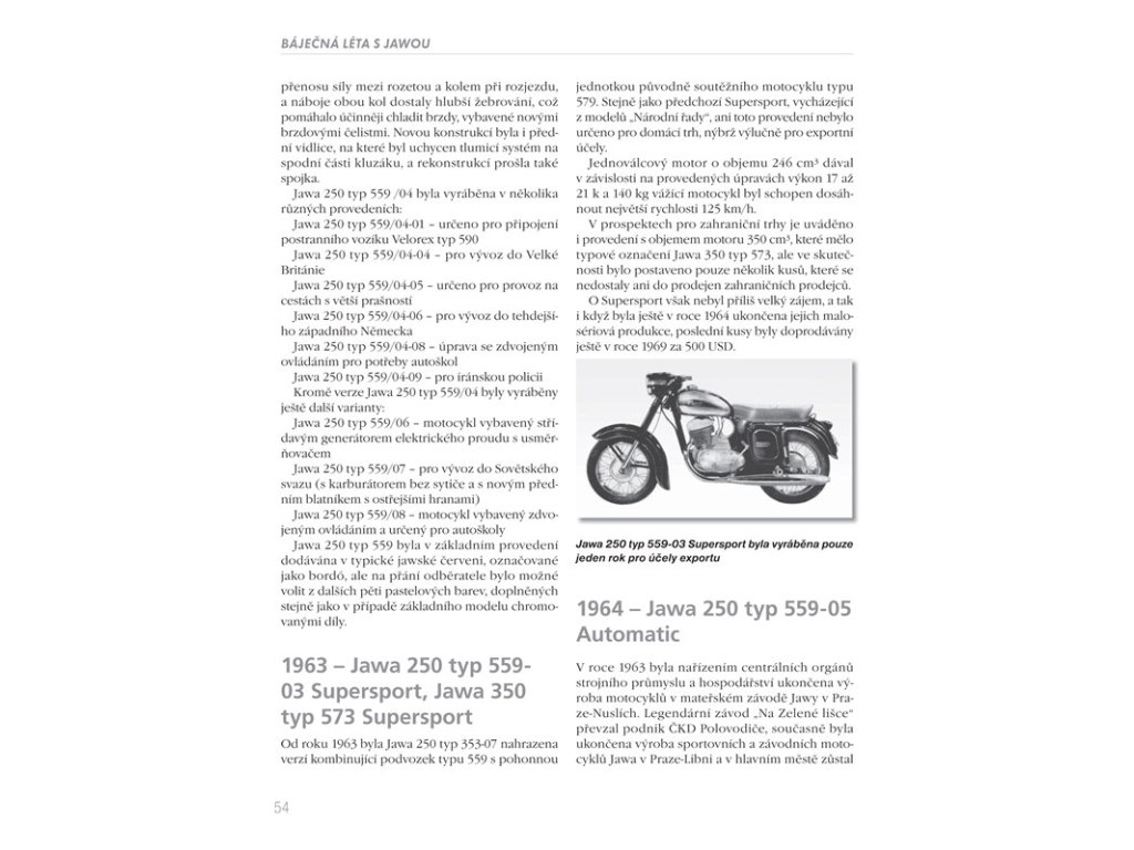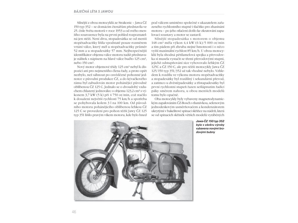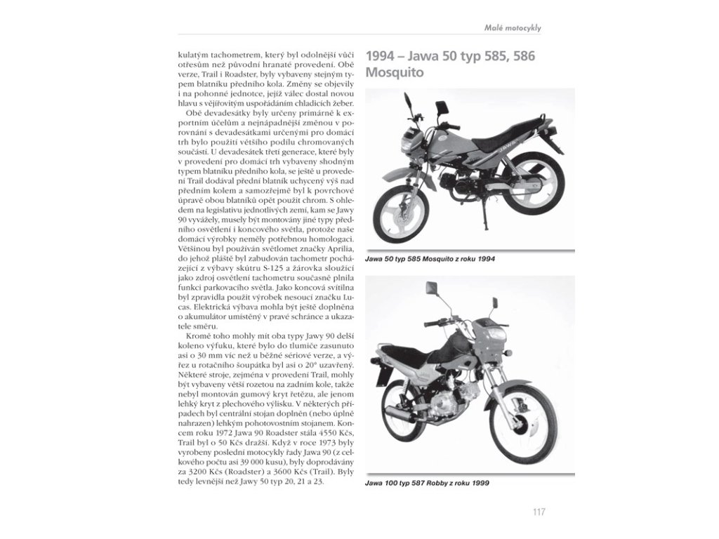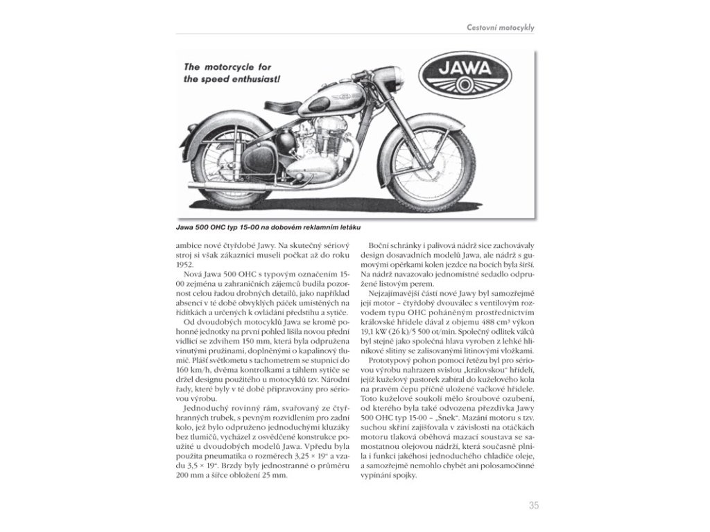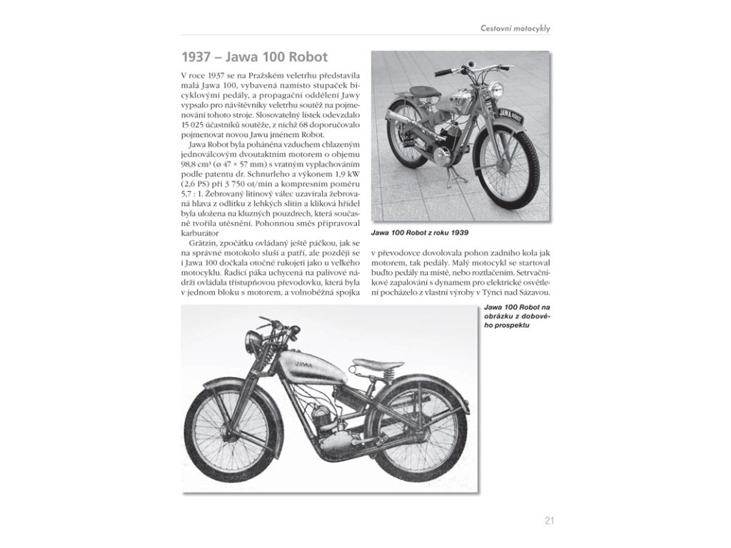 Kniha, která potěší všechny příznivce jedné stopy a zvláště pak fandy legendární značky Jawa. Chronologicky seřazená historie a popis jednotlivých modelů napříč celým výrobním spektrem až do současnosti - od cestovních motocyklů přes prototypy, malé motocykly, závodní a soutěžní stroje až po automobily - Vás podrobně a čtivou formou seznámí se značkou, které vdechl život její zakladatel František Janeček už v roce 1929. - ucelený chronologický přehled produkce legendární značky - desítky modelů od r. 1929 do současnosti - barevné i černobílé fotografie - technika a konstrukční zajímavosti - osobnosti spojené se značkou Jawa - cestovní a malé motocykly, prototypy - sportovní, závodní a terénní motocykly - Jawa a automobily