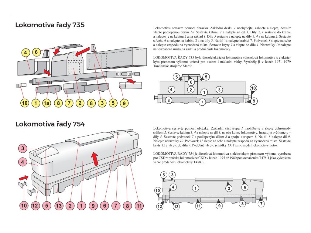 Součástí vystřihovánky jsou modely lokomotiv řad 742, 754 Brejlovec a 735.