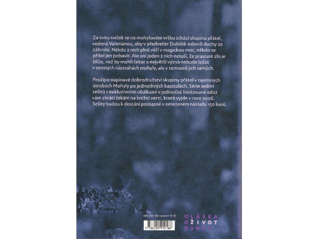 Prožijte napínavé dobrodružství skupiny přátel v tajemných útrobách Mohyly po jednotlivých kapitolách. Série sedmi sešitů s exkluzivními obálkami v jedinečné limitované edici vám zkrátí čekání na knižní verzi, která vyjde v roce 2026. Sešity budou k dostání postupně v omezeném nákladu 150 kusů.