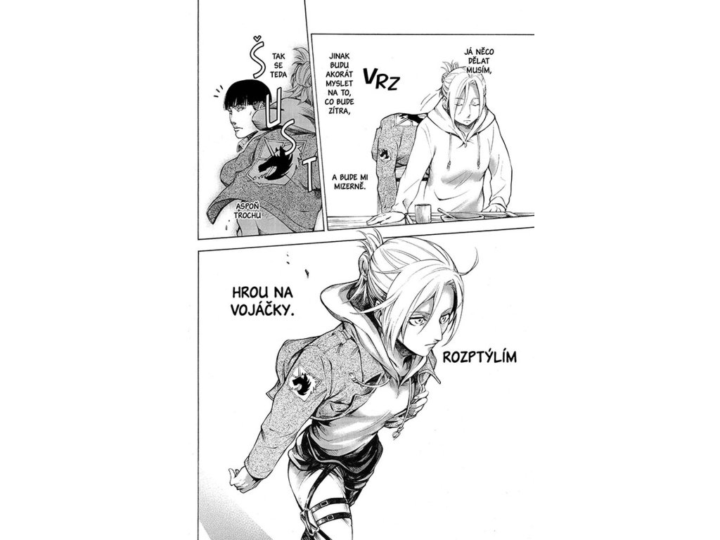 „Zítra, až se Průzkumníci vydají na svou 57. výpravu za Zeď, splním svou povinnost a polapím Erena Yeagera.“