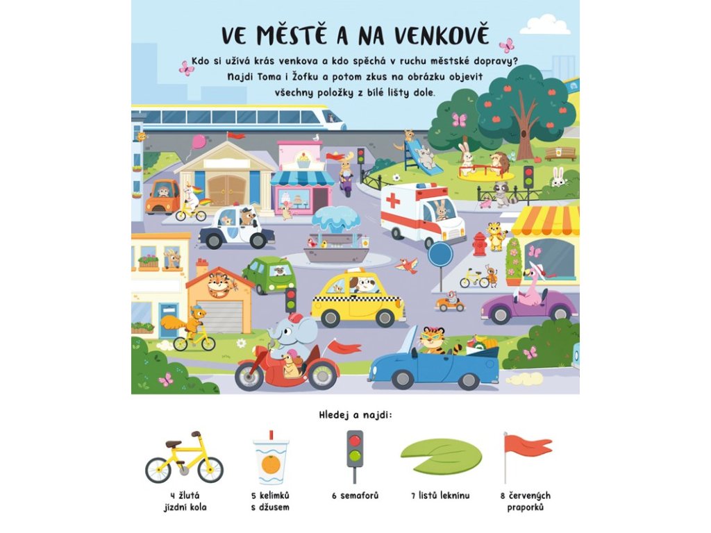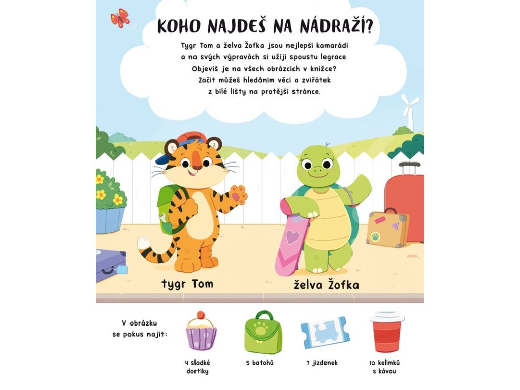 Tygr Tom a želva Žofka se rozhodli prozkoumat hektický svět dopravních prostředků. Co všechno v něm objeví? Malí čtenáři se s nimi podívají na nádraží, na letiště i na mořské pobřeží, zjistí, na čem všem se dá jezdit na zasněženém svahu nebo létat v povětří a vypraví se dokonce i do vesmíru. Tipy k hledání věcí i zvířátek na každé dvojstraně pomohou dětem procvičit postřeh a počty od 1 do 20, ale kromě toho na ně čeká ještě poslední stránka s prémiovými úkoly, která prověří paměť a zaručí, že knížka Vozidla nebude jen na jedno přečtení.