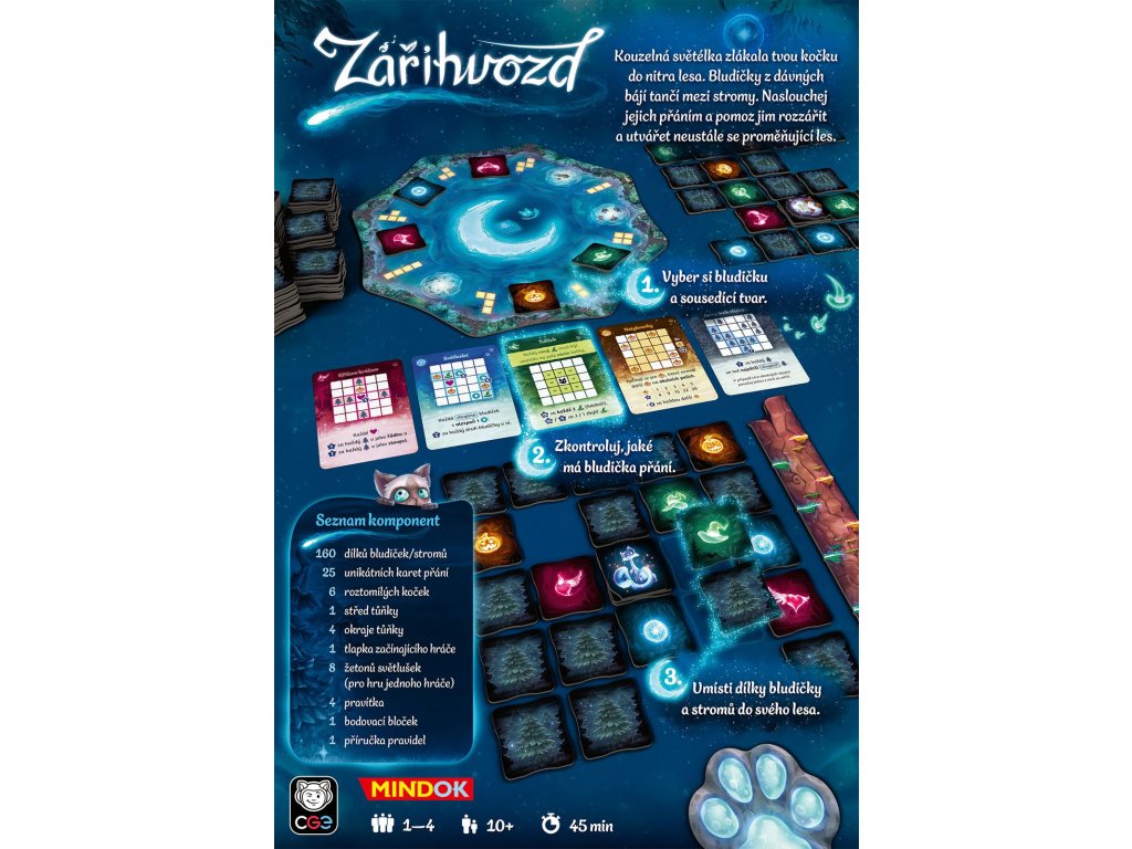 Vítejte v magickém lese Zářihvozd! Stanete se stavitelem lesa, který láká tajemné Bludičky – okouzlující bytosti čtyř různých druhů, které mají svá specifická přání. Vaším úkolem je strategicky umisťovat tyto bludičky a dílky stromů do svého rostoucího lesa tak, abyste co nejlépe splnili jejich karty přání a získali nejvíce bodů. Hra je variabilní díky pěti balíčkům karet přání (jeden pro každý druh bludičky a jeden pro stromy), z nichž se na začátku hry volí vždy jedna karta. Můžete začít s jednoduššími kartami označenými jednou pacičkou.